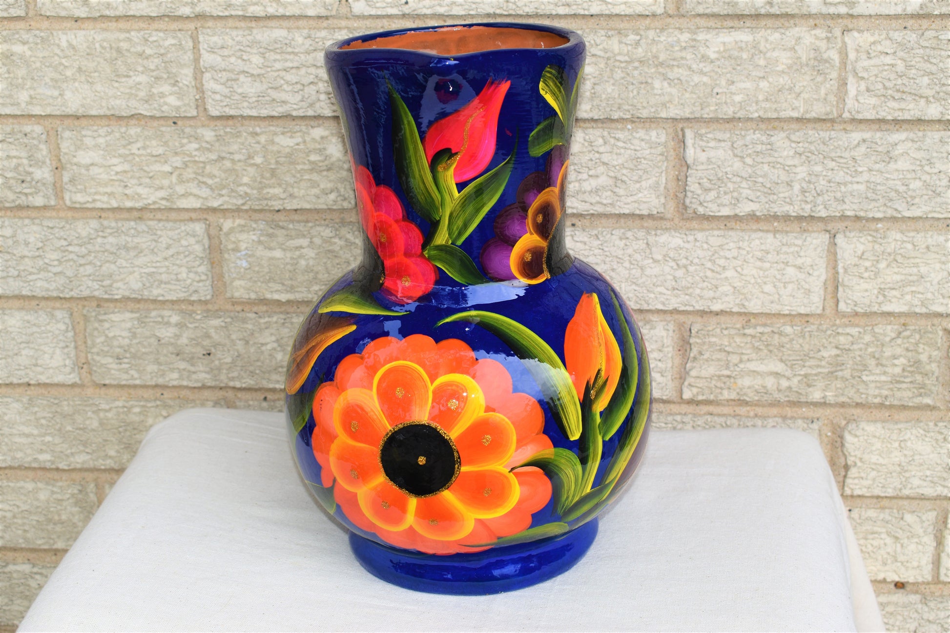 This fun pitcher has vibrant colors and flowers. The pictures do not do justice on how this jarro looks in person. It can be used as a pitcher or flower vase. Definitely a head turner and conversation starter. It has a glossy finish and looks elegant. The barro pitcher de Guerreo is made from high-grade ceramic, giving it a smooth and elegant finish that adds a touch of sophistication to any living area. With its vibrant colors and eye-catching flower design, it's sure to be a conversation starter.